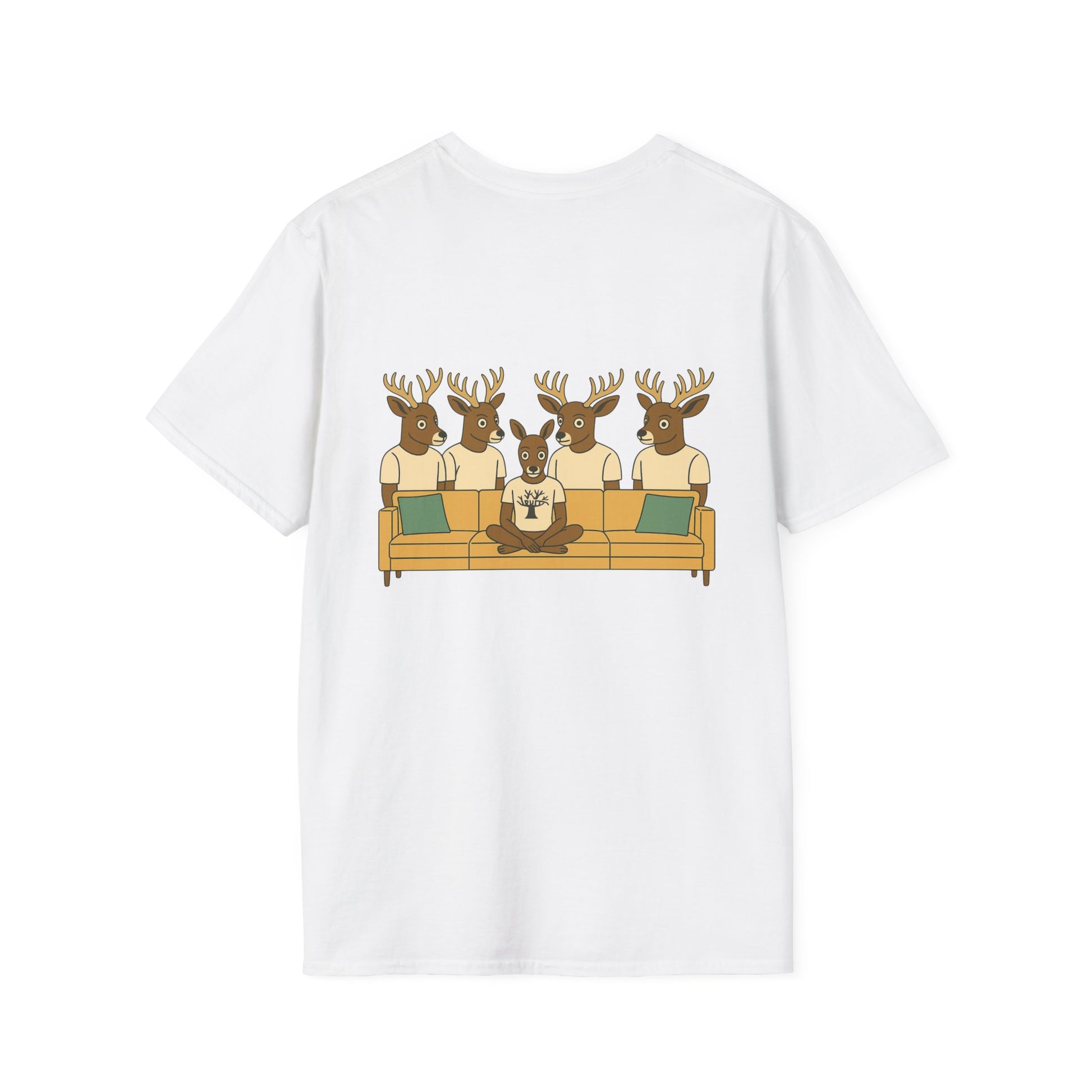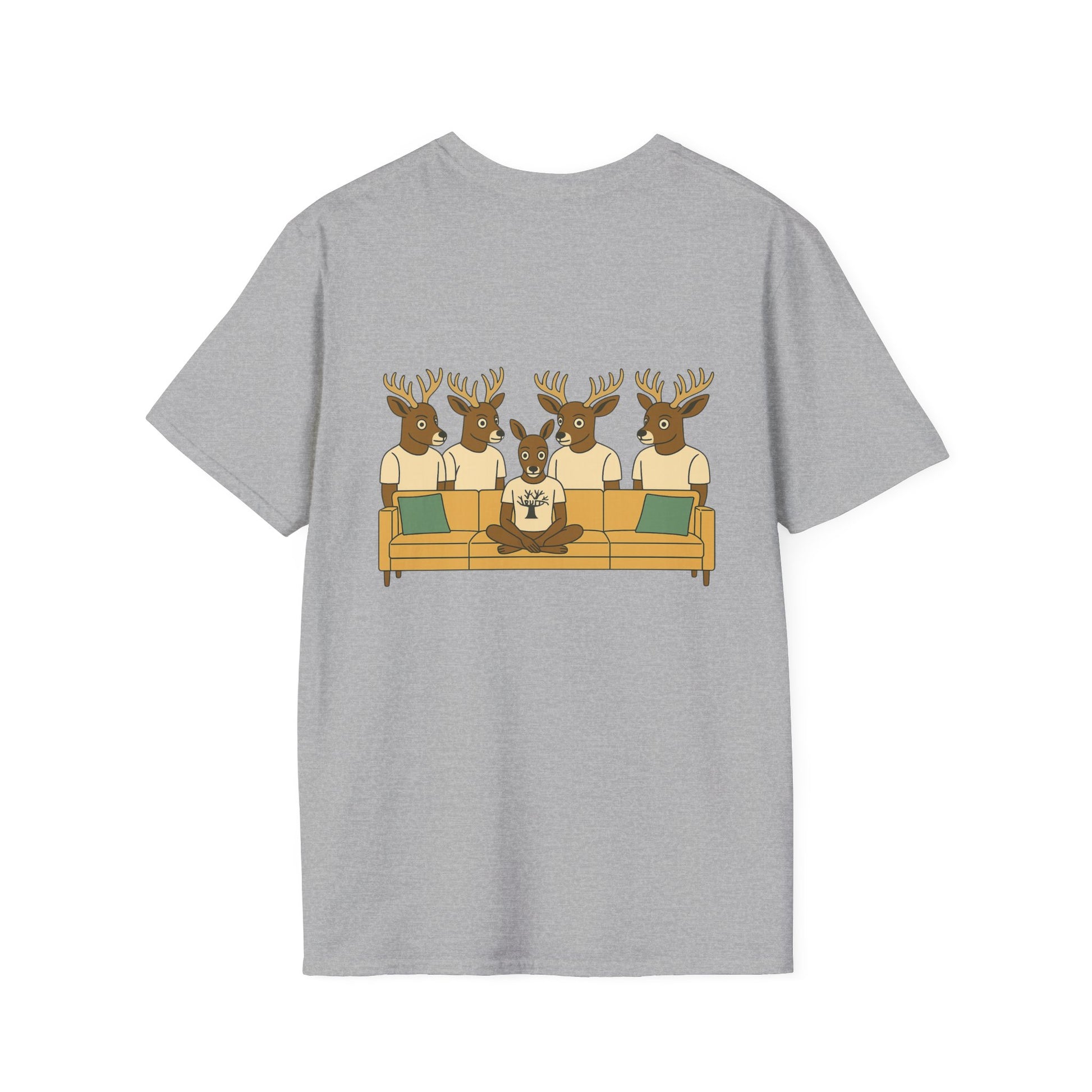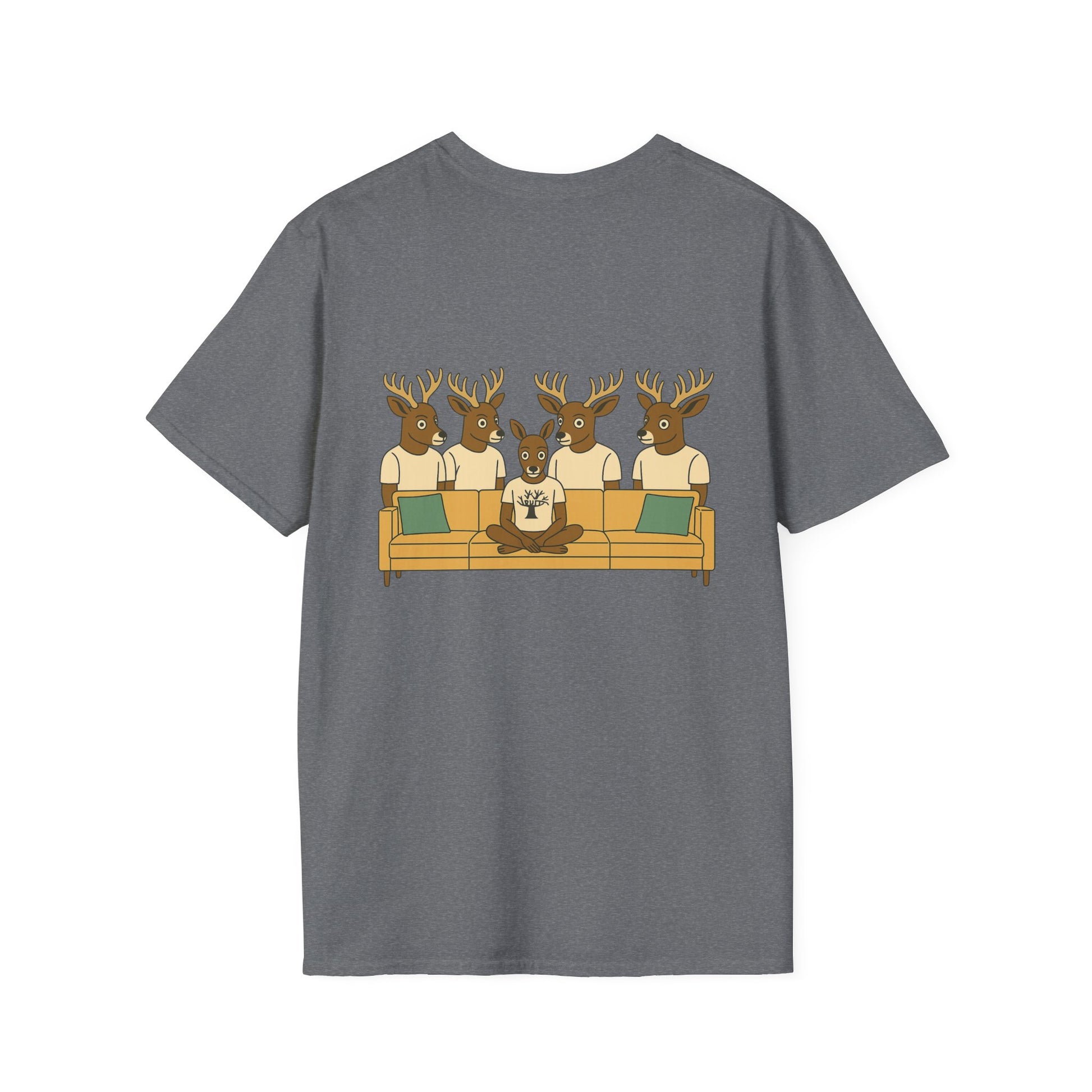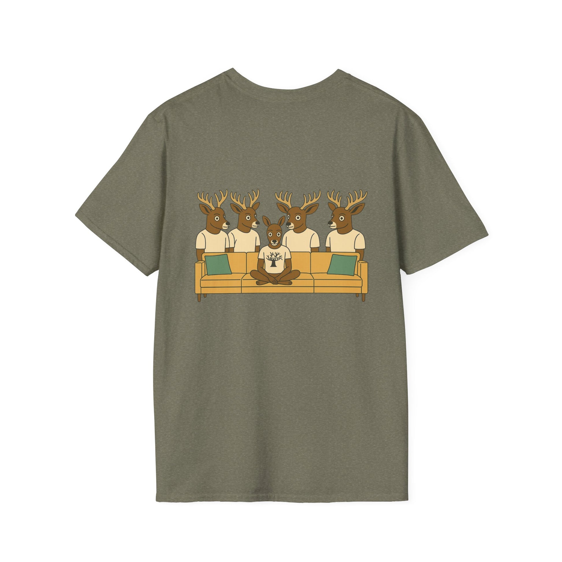 Bring the laughs wherever you go with this bold and cheeky hunting-themed graphic tee. Featuring a humorous scene of one wide-eyed doe surrounded by four relaxed bucks on a couch, it’s the ultimate conversation starter. Printed in vibrant colors on a soft, durable shirt, it’s perfect for hunters, outdoorsmen, or anyone with a sense of humor.